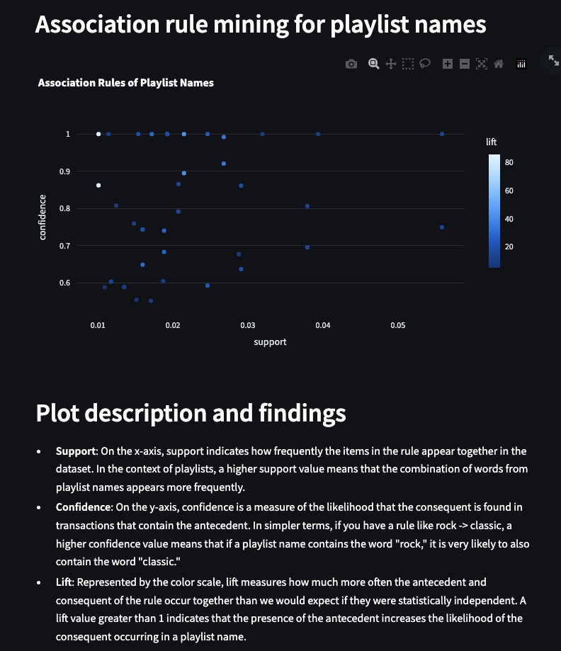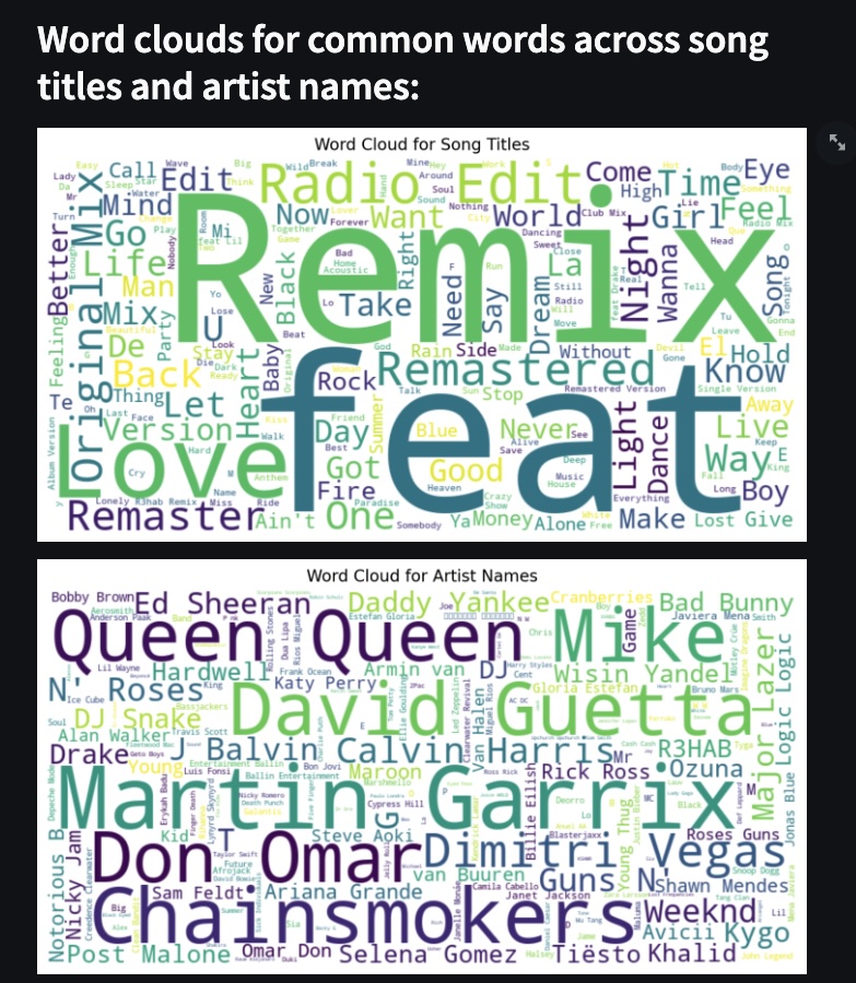 To further explore the world of NLP, I learned about concepts such as association rule mining and N-gram analysis, which I applied to playlist titles in the dataset. I also learned about the common use of word clouds, which I applied to song names and artist titles.