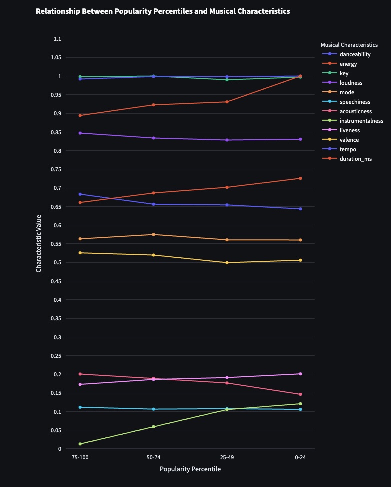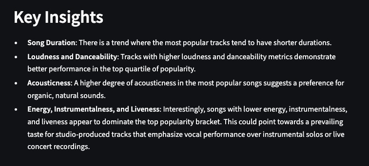 Finding insights in the data based on music popularity and its correlation with musical characteristics was fascinating and a rich learning experience. Some of the insights found can be seen below.