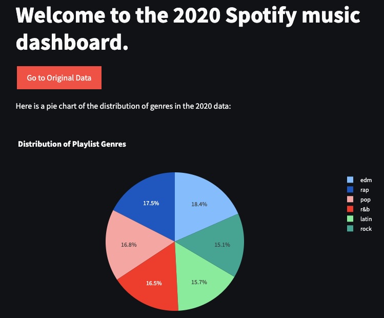 Welcome to my 2020 Spotify music dashboard which was my first project in the world of data science. Developed as a fun and educational venture, this project revolved around constructing an interactive data dashboard using 2020’s top music chart data. The dashboard is accessible at musicdash.streamlit.app. The main focus of this project was the exploration of Natural Language Processing (NLP), a fascinating domain of data science that I’ve delved into to decipher patterns and trends in popular music. Through this dashboard, I’ve ventured into basic NLP concepts like text processing, tokenisation, stemming, lemmatisation and have undertaken sentiment analysis on song titles to capture the emotional essence of popular tracks. Additionally, this project has been an opportunity to experiment with text classification techniques, aiming to categorize songs by their genre or mood. This project was powered by Python and the user-friendly Streamlit framework. I’m open to ideas, feedback, and collaboration from fellow enthusiasts. Stay tuned for more updates as this project continues to evolve!